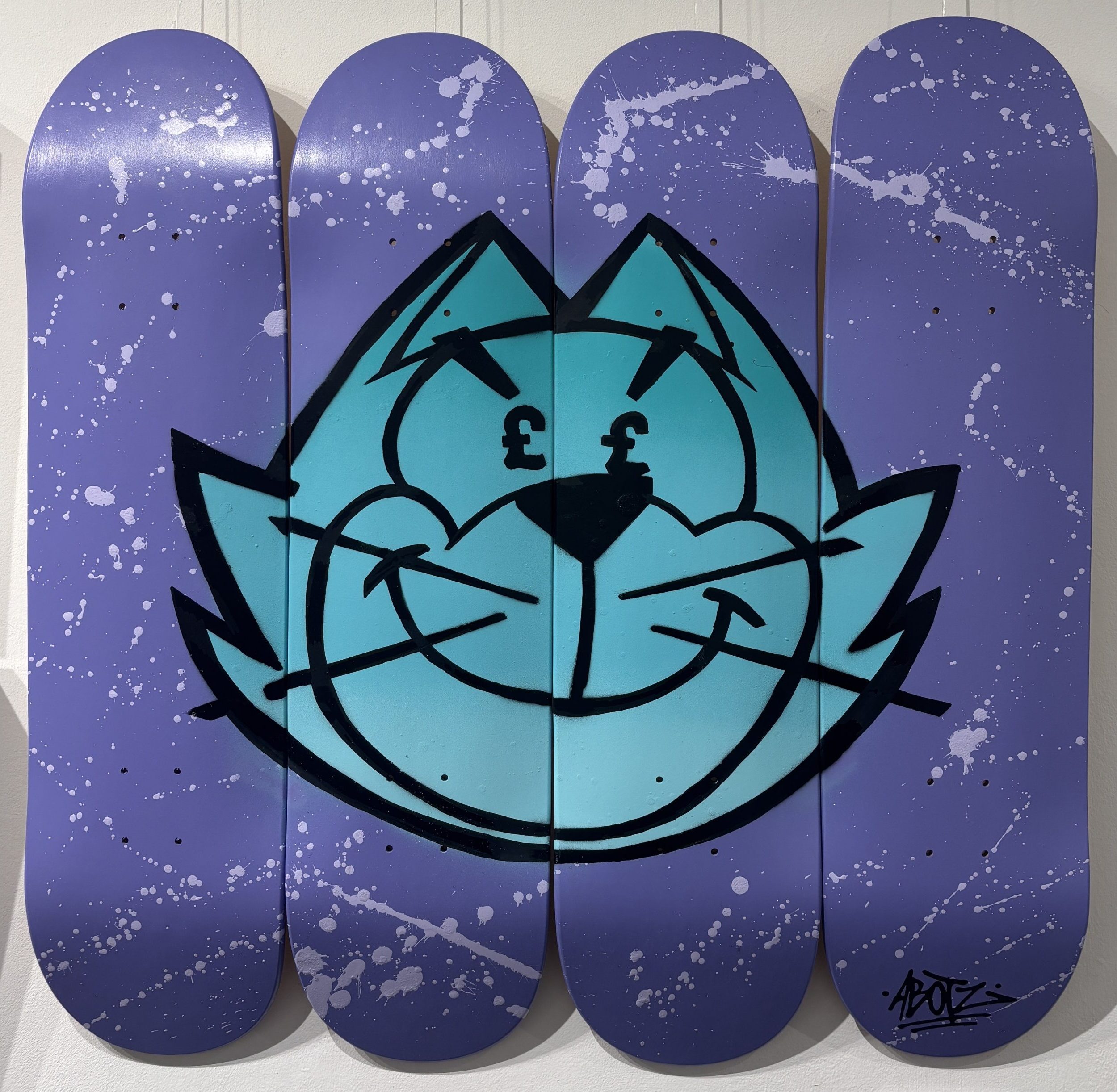 Acrylic and spray paint on 4x skateboard